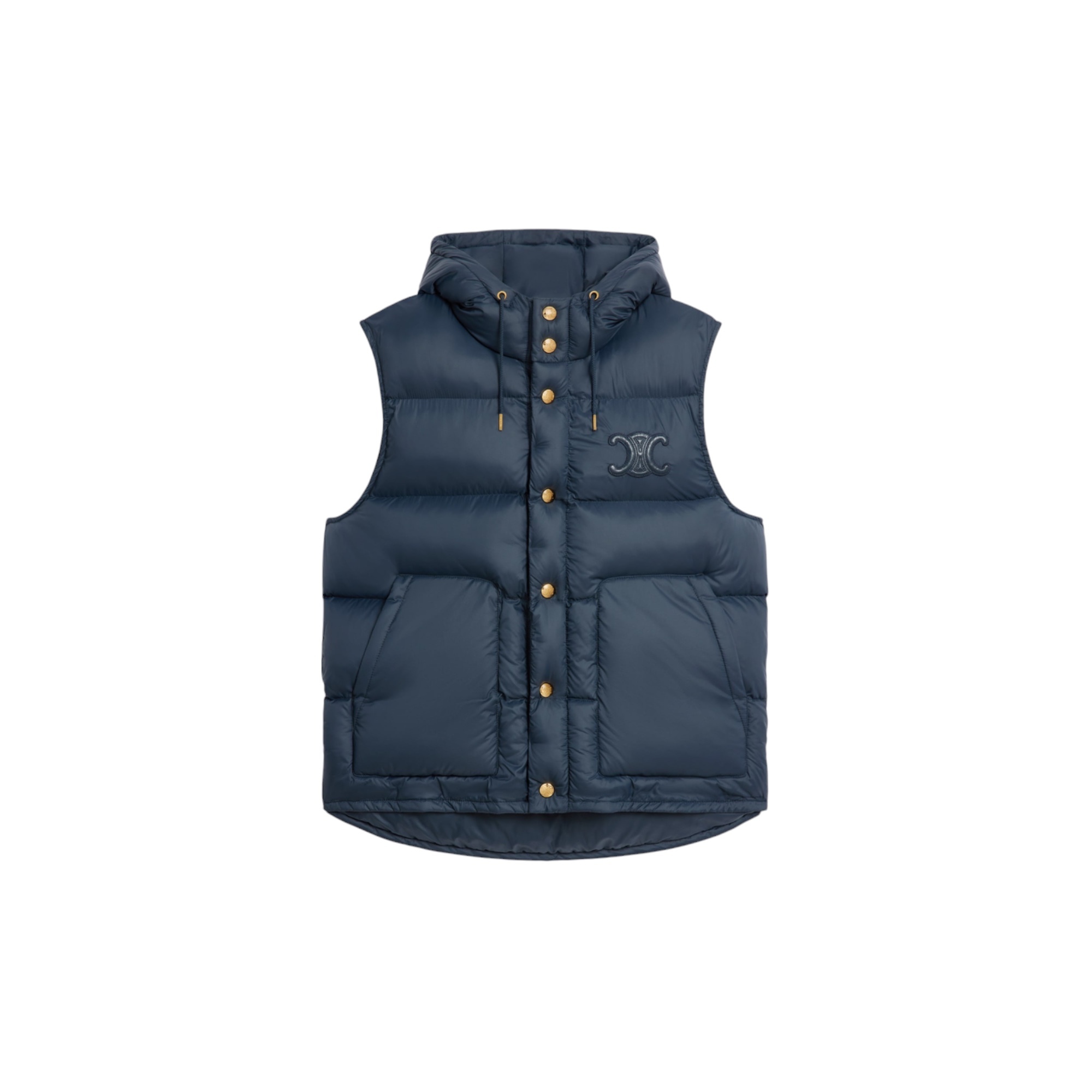 Стеганый жилет с капюшоном, высоким воротом и боковыми карманами. Изделие украшено логотипом бренда спереди.