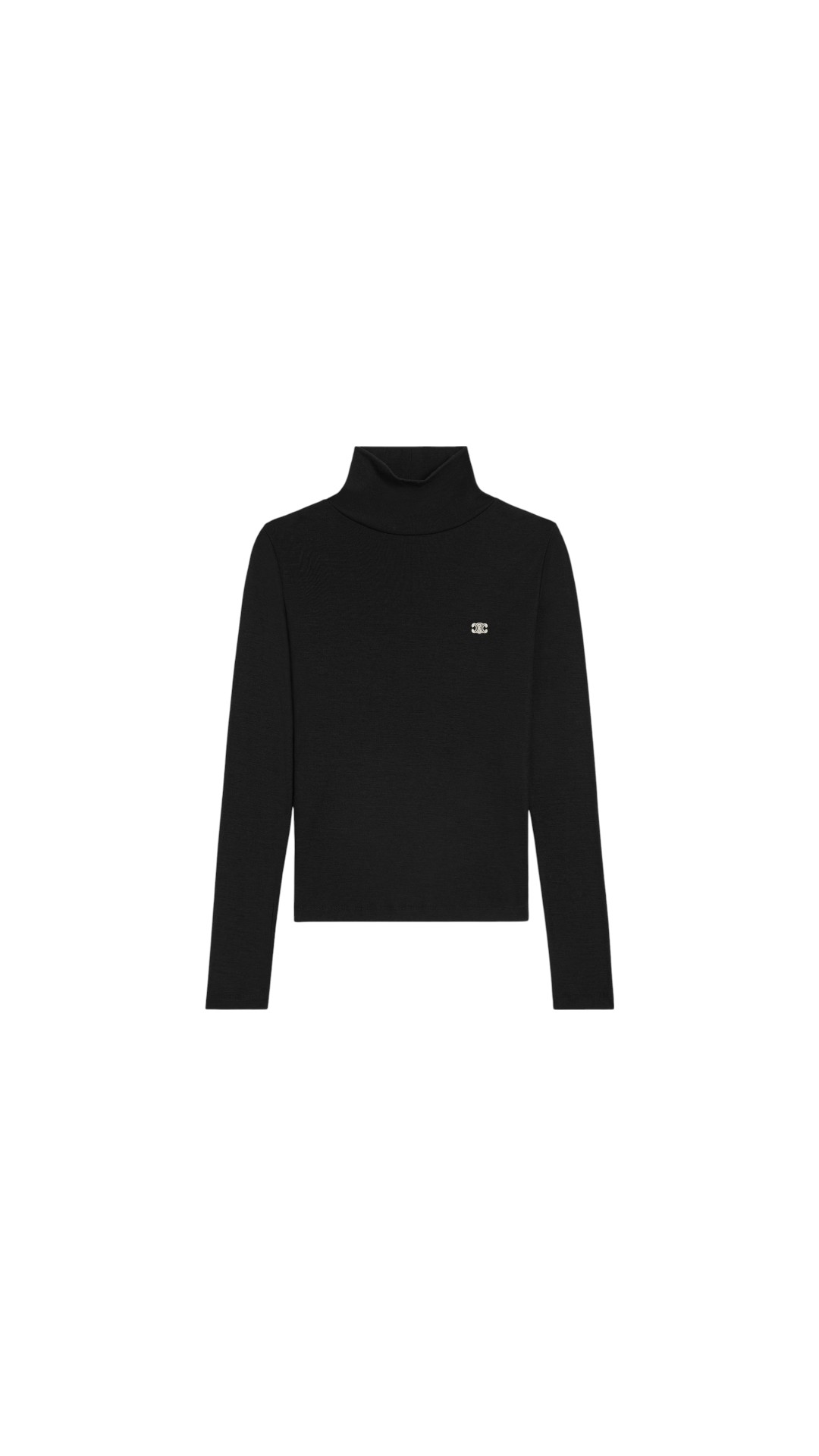 Базовый джемпер из шерсти приталенного силуэта с высоким горлом дополнен спереди контрастным вышитым логотипом бренда.