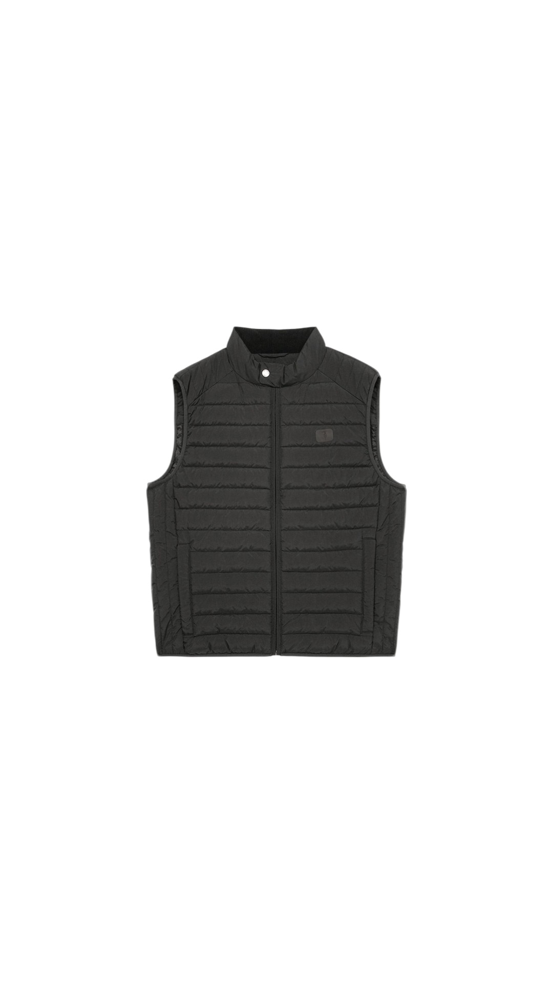 Стеганый жилет с застежкой на молнию дополнен воротником стойкой, внутренним и внешними карманами. Изделие спереди украсили патчем с логотипом бренда.